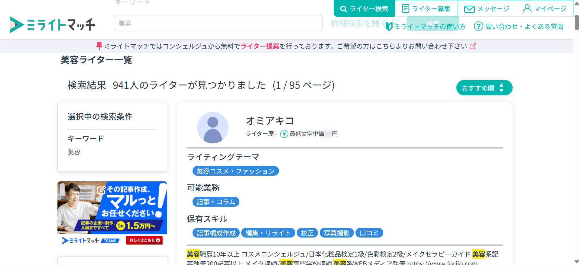 美容ジャンルに強いライターだけを厳選して掲載している美容ライター特集ページなら、自社のニーズに合うライターを簡単に検索できます。