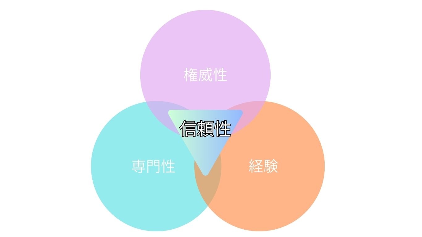 信頼性は図のように、E(経験)-E(専門性)-A(権威性)のトータル値です。3要素のいずれかに偏りがないかチェックしておきましょう。