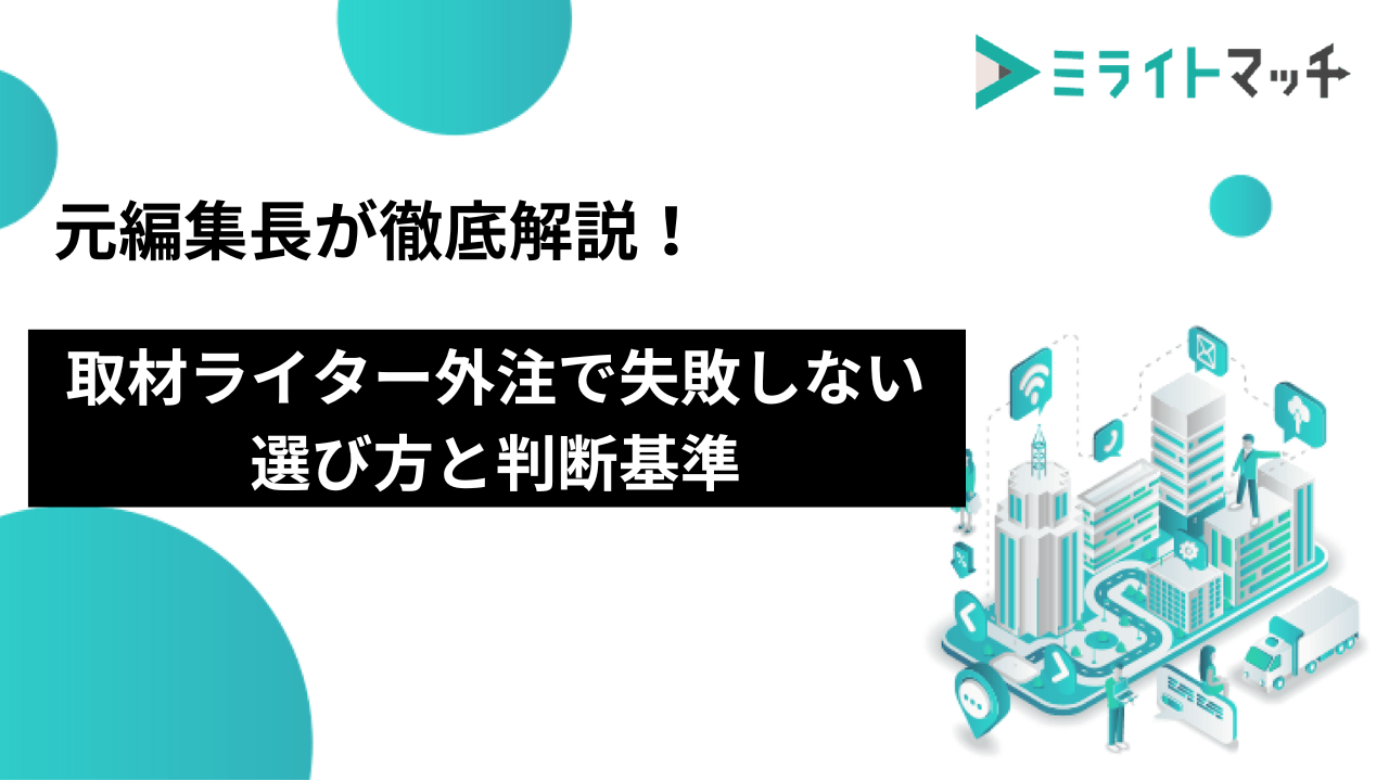 専門性の高いライターを探すのに苦労している企業様、まずはご自身で探してみたい方は、ミライトマッチの「取材ライターの仕事を外注・依頼・代行・採用するならミライトマッチで探そう」のページよりすぐに見つけることができますので、活用してみてください。